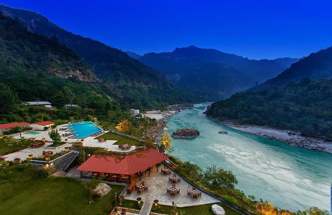 Aloha On The Ganges By Leisure Hotels is a 4-star Rishikesh hotel with an 8.3/10 rating on Booking.com. The hotel features spacious accommodations, a Tattva Spa, and various outdoor activities for guests. With direct access to the Ganges River, it offers a tranquil escape surrounded by lush vegetation.
