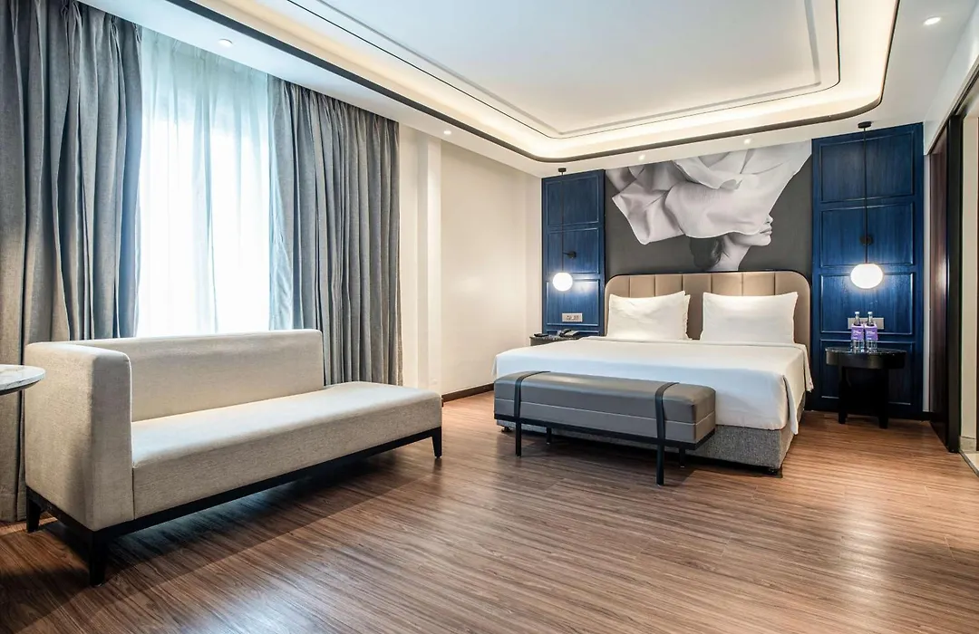 Rooms at Radisson Blu Hotel Ahmedabad include Superior Rooms, Business Class Rooms, Junior Suites, and Presidential Suites, all equipped with free Wi-Fi and 46-inch LCD TVs. The Superior Rooms offer spacious contemporary accommodations with city views, while the suites feature upscale amenities like a stylish bathroom with a walk-in bathtub and rain shower.