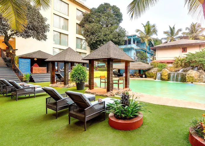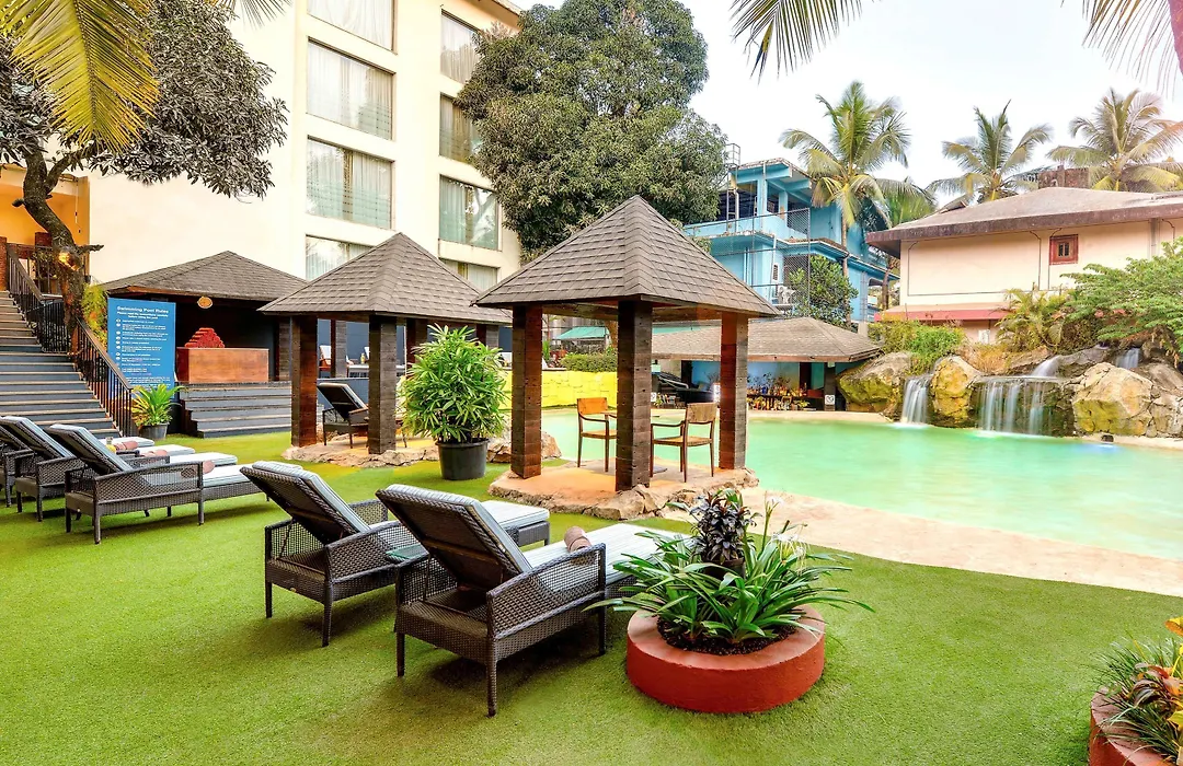 Novotel Goa Candolim (5-star), rated 7.6/10 on Booking.com, features family-friendly accommodations with access to Goa's only supervised kids club, Happy Place. The hotel offers multiple dining options, a fitness centre, and a massage centre, all situated at the heart of Candolim street.