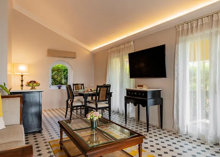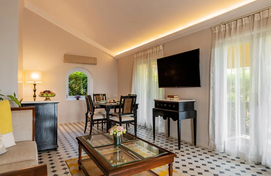 Taj Holiday Village Resort & Spa, Goa offers 142 individually furnished rooms featuring air conditioning, premium bedding, and 24-hour room service. Accommodations include options with scenic garden views or sea views, with larger villas offering a separate living area and outdoor seating. The charming terracotta cottages are designed in a colourful palette, enhancing the resort's aesthetic appeal.