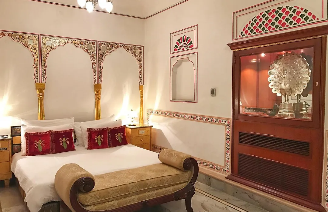 Rooms at The Raj Palace offer 24-hour room service, premium bedding, and thoughtful touches such as pillow menus. Many accommodations feature antique furniture and pieces from the Royal Family's museum collection. The hotel's design includes high ceilings with crystal chandeliers and a private passage connecting different pavilions.